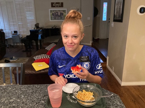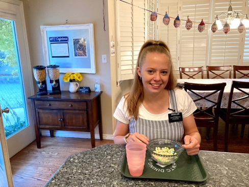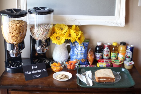 I made sure to be home from the pickle ball party in time to set up the cafeteria for Sister Lund. Today she chose an egg salad sandwiches, a fresh peach, carrots, chips, apple juice, and freshly baked cookies (from frozen cookie dough). This is so fun! (You can see we had a few boys do a “missionary morning” to earn their turn at the cereal dispenser today!)