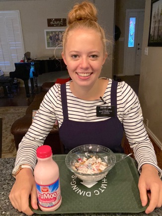 Sister Lund looked adorable in her new outfit! After our morning run, she enjoyed a yogurt parfait and tried out strawberry milk. Mmmm.