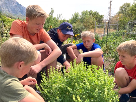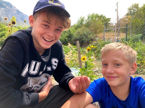 Andrew’s friend Tristan came with us. I found a praying mantis in the basil bush, which Tristan befriended.