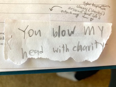 Tyler taped this note to a small Cherry Airhead and left it in Natalie’s mailbox outside her door. He told her he would’ve given her a bigger Airhead, but there weren’t any cherry flavored big ones (to go with his clever “cherry-ty” line).